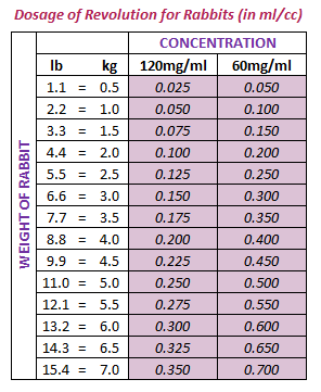 1. Target dosage in mg/kg. Many rabbit-savvy will dose between 12-15 mg/kg. Best given by a rabbit-savvy vet. Dr.H, at the HRS International HQ, recomends 0.05 mL per 1 pound using the concentration of 120 mg/kg. This works out to 12.228 mg/kg, this is the default used.